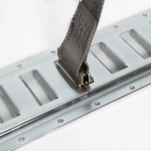 Logistic E Track Straps are ideal for securing any load to the wall of an interior van trailer. These straps fit easily and securely into E track, A track, and F track.The easy release fitting makes the e track straps the preferred way to secure cargo for interior van haulers. The ratchet allows you to get these straps tighter than the Cam Buckle Straps.